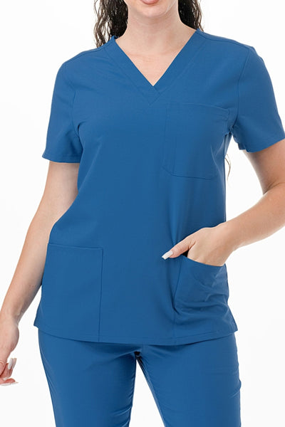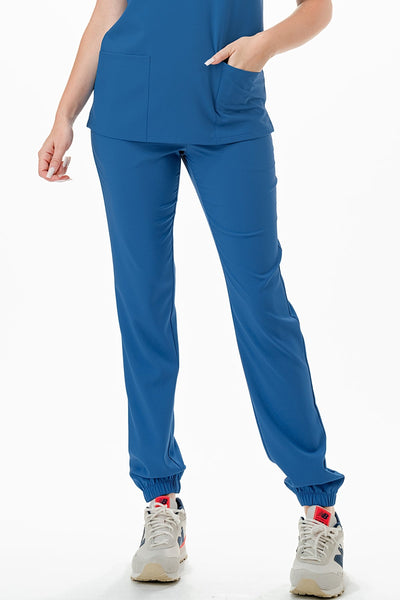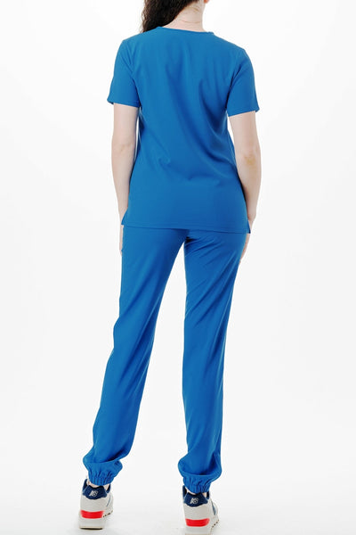 AJ1002 Medical Scrub Set 4 Way Stretch 6 Pockets V-Neck Top Joggers Pants Uniform Classic Blue