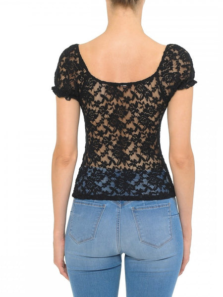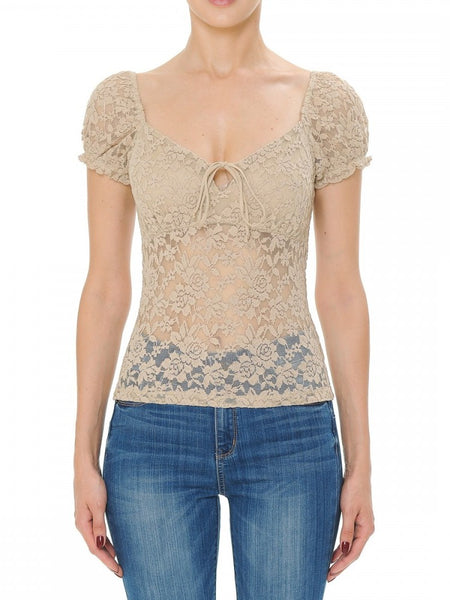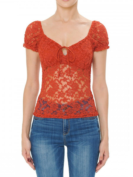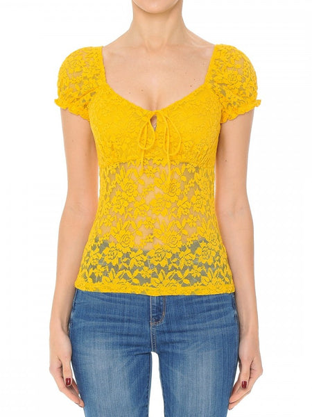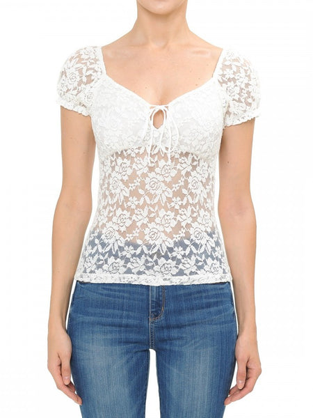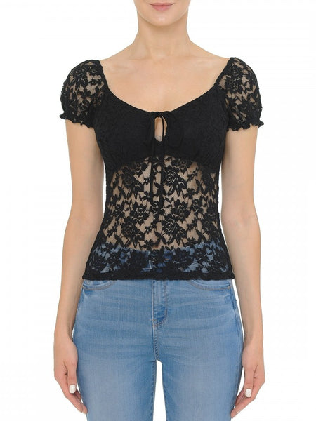 A peasant top in a floral knit lace fabrication featuring a tie-front neckline Ruffle-edged short puff sleeves