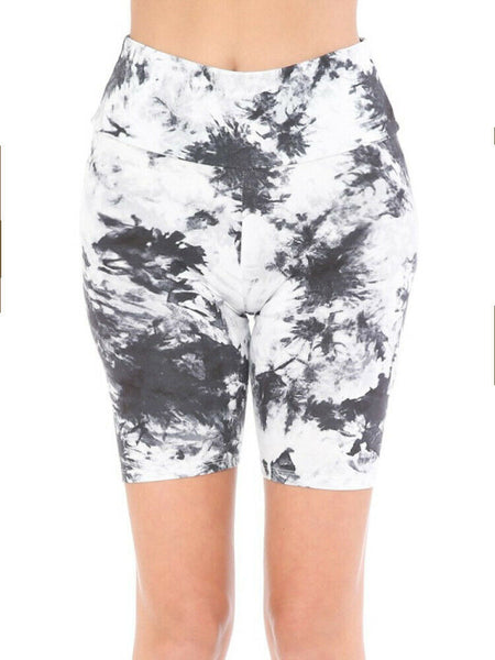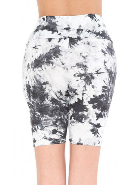 - High-waisted bike shorts in a multicolor tie-dye print, cotton jersey knit fabrication