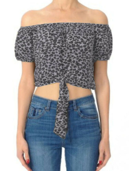 71033 Off Shoulder Blouse Top Animal Print Tie Front Loose Fit